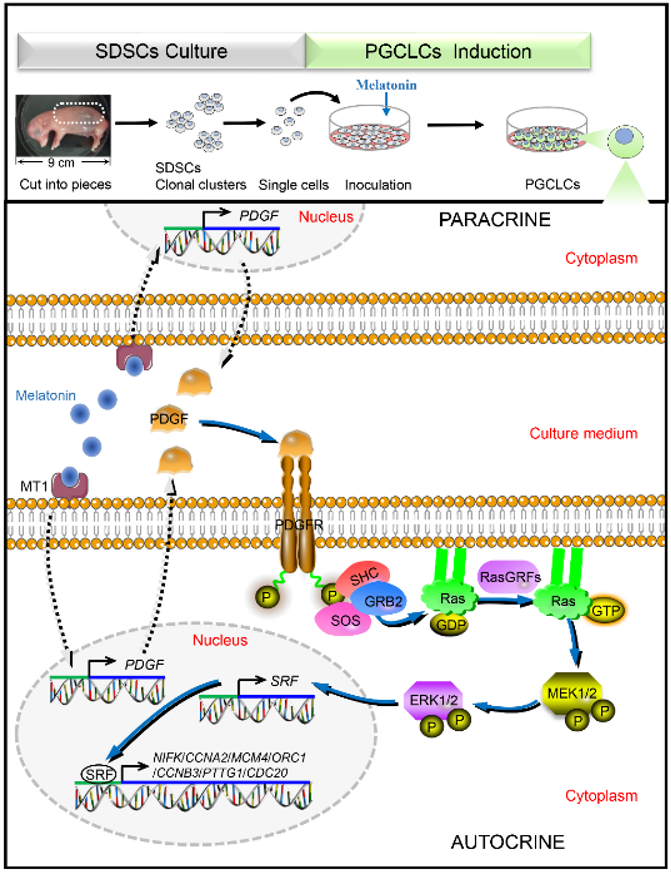 我国具有悠久的养猪历史,且拥有全球1/3的地方猪种质资源。但近年来,我国地方猪种养殖量急剧减少,部分地方品种几近灭绝,导致地方猪种遗传资源多样性遭受严重破坏,优质基因不断流失。目前猪遗传资源保护的一些方法,如原位保存、精液冷冻保存、DNA文库保存和体细胞库保存等,均具有一定的局限性。干细胞是一类可以自我更新并具有多向分化潜能的细胞群体,它不仅能分化成不同类型的细胞,还可以通过有丝分裂维持自身的遗传稳定性。无论是从现有扩群的技术途径还是从未来发展前景看,干细胞保种具有其它技术保重不可替代的优势。我校必赢线路检测中心生猪种业创新团队程顺峰教授研究组在构建地方良种猪干细胞种质资源库的基础上,进一步对猪干细胞进行创新应用。研究组以体外分离纯化的猪皮肤来源干细胞(SDSCs)为实验材料,研究了其体外转分化为原始生殖细胞样细胞(PGCLCs)的分子调控机制,发现褪黑激素(MLT)能显著促进分化的PGCLCs体外增殖。该研究证实,SDSCs转分化PGCLCs过程中,MLT经褪黑素受体1(MT1)介导可显著提高血小板衍生生长因子(PDGF)的转录和翻译水平,PDGF通过自分泌和旁分泌作用途径激活PDGF受体,随后刺激Ras并进一步激活转录因子血清反应因子(SRF),靶向调控细胞周期相关基因的表达,从而促进PGCLCs增殖。该研究系统地阐明了MLT通过MT1介导的MAPK信号通路在PGCLCs体外增殖中的作用途径和分子机制。