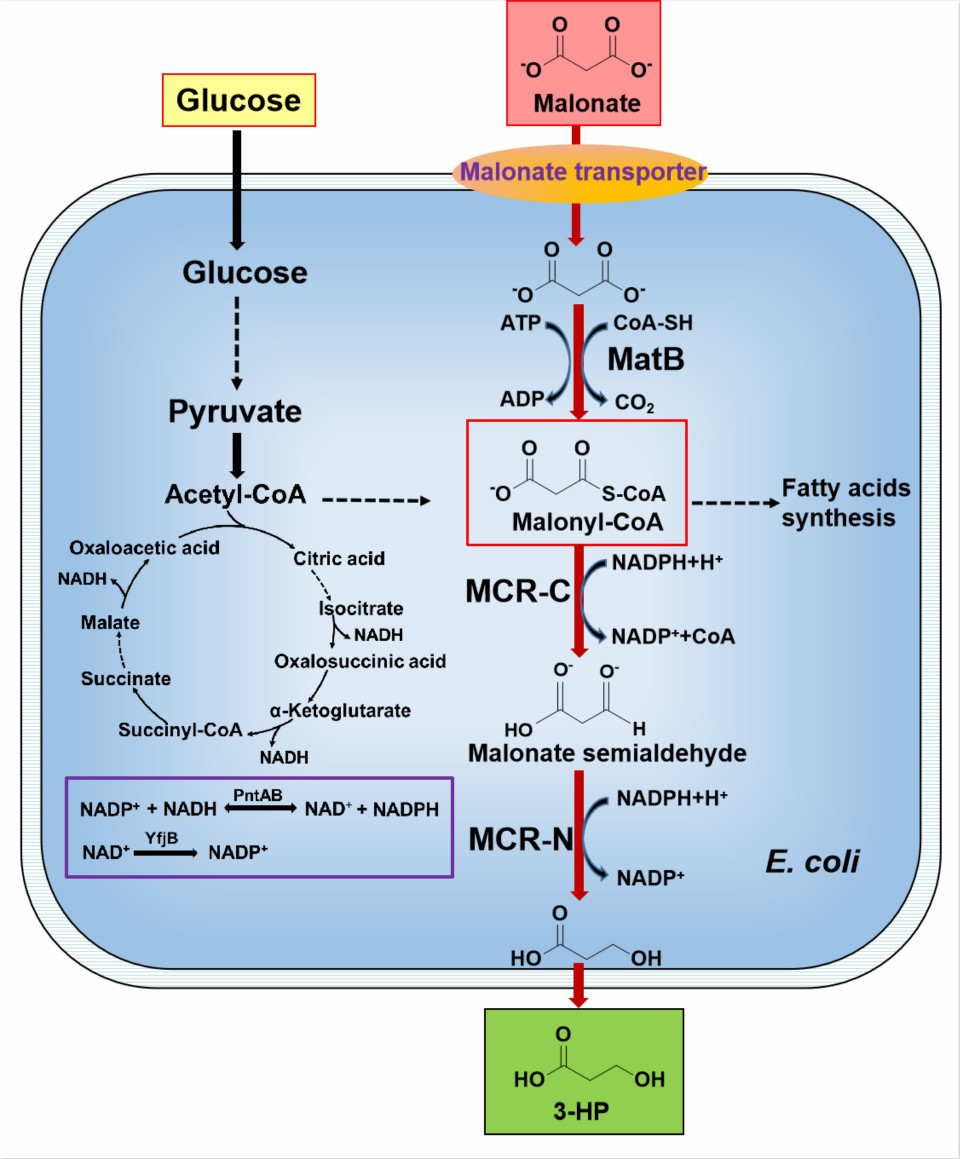 Fig.1 3-HP synthetic pathway in E. coli using malonate as substrate