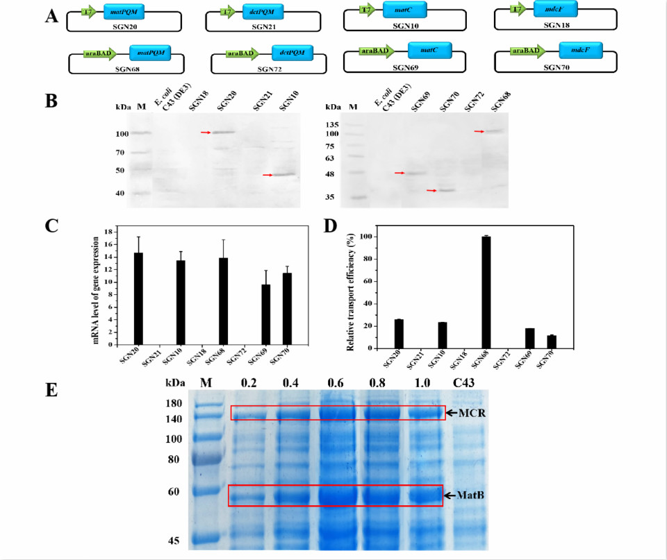 Fig.2 Identification of malonate transportation function in E. coli. (A) Construction of recombinant strains carrying malonate transport genes. (B) Western Blot analysis of expressed malonate transport proteins. (C) Transcription analysis of transporter genes. (D) Relative malonate transport efficiency of tested transporters. (E) SDS-PAGE analysis of the expression levels of the enzymes by varying the concentration of the inducer IPTG.
