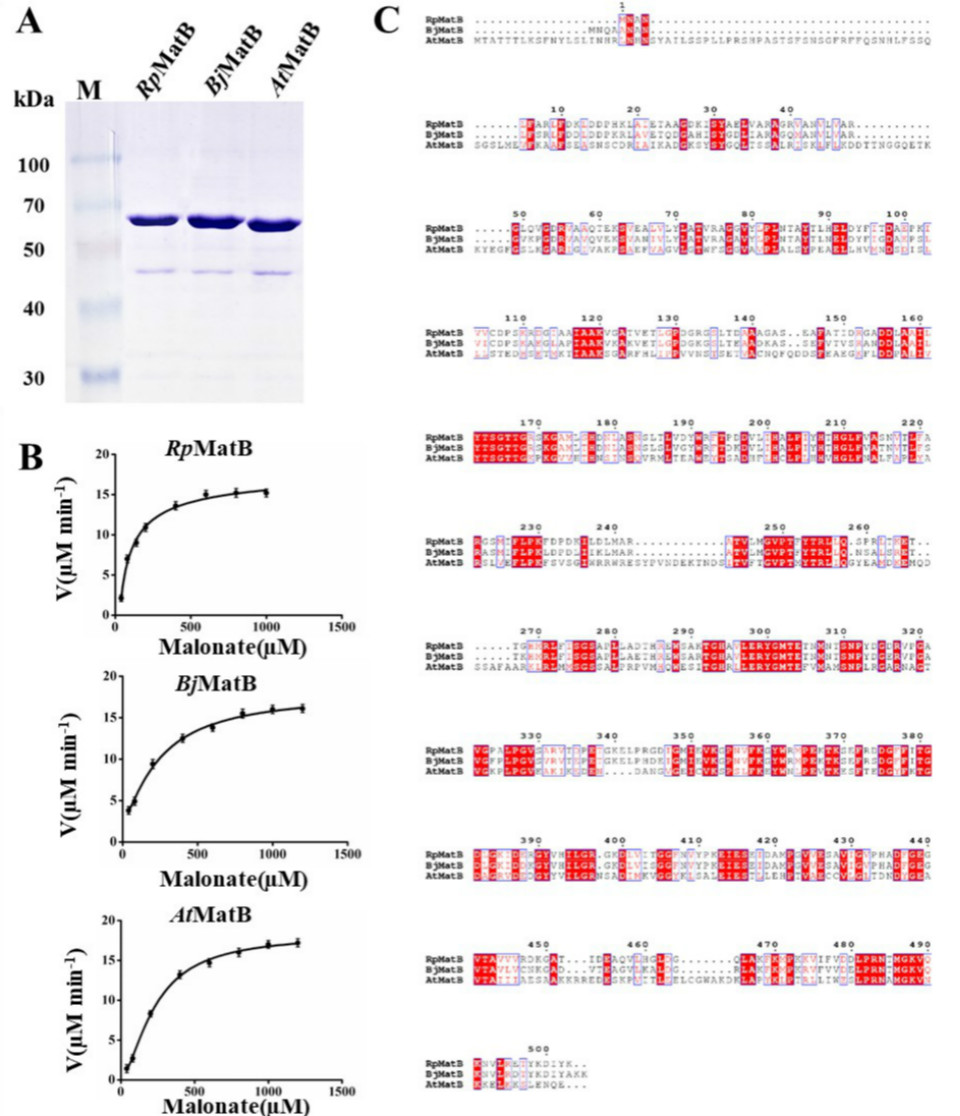Fig3 Characterization of MatB. (A) SDS-PAGE analysis of the purified MatB. (B) Michaelis-Menten equation curves for three kinds of MatB. (C) Sequence alignment of MatB from R. palustris (RpMatB), B. japonicum (BjMatB) and A. thaliana (AtMatB). The alignment was performed using ClusterW.
