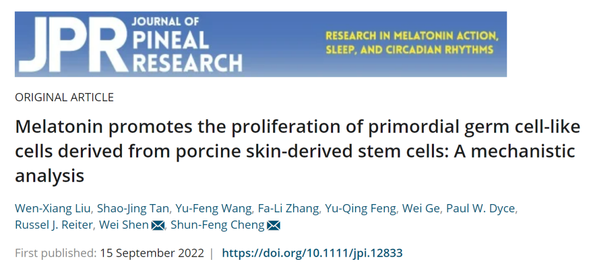 近日,必赢线路检测中心生猪种业创新团队程顺峰教授研究组在中科院一区、TOP期刊《Journal of Pineal Research》(IF=12.081)上发表研究论文“Melatonin promotes the proliferation of primordial germ cell-like cells derived from porcine skin-derived stem cells: A mechanistic analysis”。该论文首次揭示了褪黑激素促进猪皮肤来源干细胞(skin-derived stem cells,SDSCs)体外分化的原始生殖细胞样细胞(primordial germ cell-like cells,PGCLCs)增殖的分子机制。