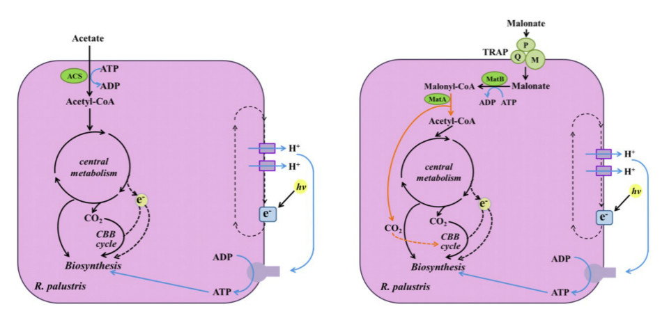 Fig. 1 Metabolic routes of acetate (A) and malonate (B) in R. palustris (Wang et al., 2020, Applied Environmental Microbiology)