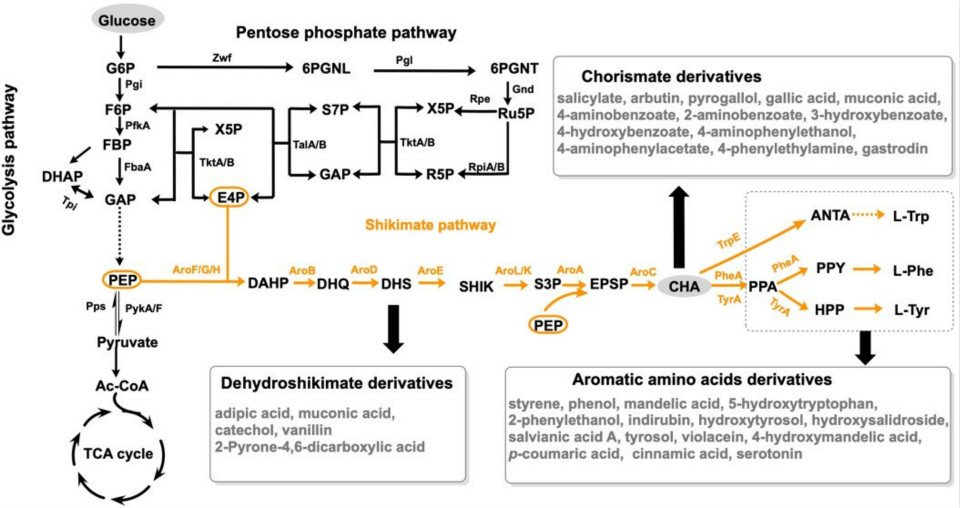 Fig.2 Metabolic pathway for aromatic compounds production from glucose in E. coli. (Li et al., 2020, Biotechnology Advances)