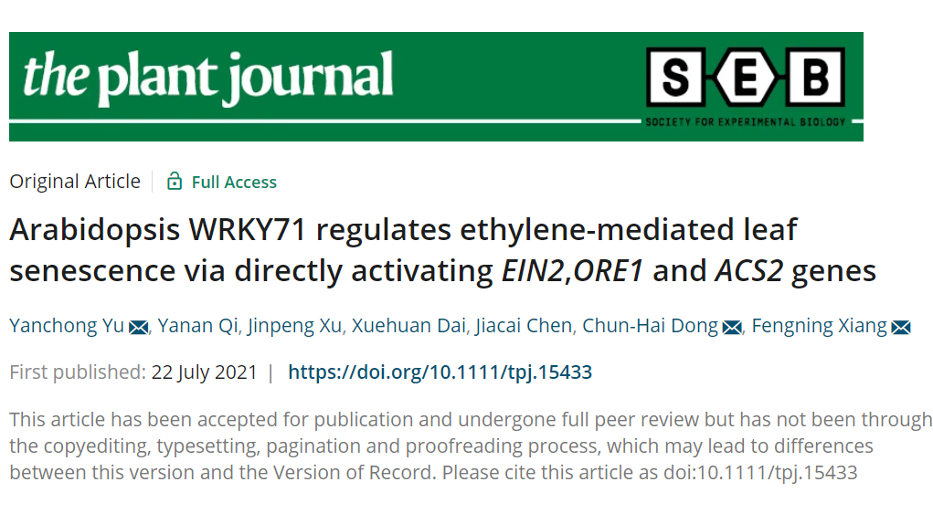 2021年7月22日,仅时隔一年,必赢线路检测中心董春海课题组再次在植物科学领域TOP期刊The Plant Journal(IF6.417)发表重要论文,题为“Arabidopsis WRKY71 regulates ethylene-mediated leaf senescence via directly activating EIN2, ORE1 and ACS2 genes”。论文揭示了WRKY71转录因子介导乙烯信号及合成促进拟南芥叶片衰老的分子机制。于延冲副教授为第一作者兼通讯作者,董春海教授和山东大学向凤宁教授为通讯作者,研究生祁亚南、徐金鹏和陈家才及山东大学博士后代学焕为共同作者,青岛农业大学为第一单位。该论文获得国家自然科学基金(31600224, 31870255)和青岛农业大学人才启动基金(1116018)的资助,得到生科院农业分子生物学平台仪器的支撑。