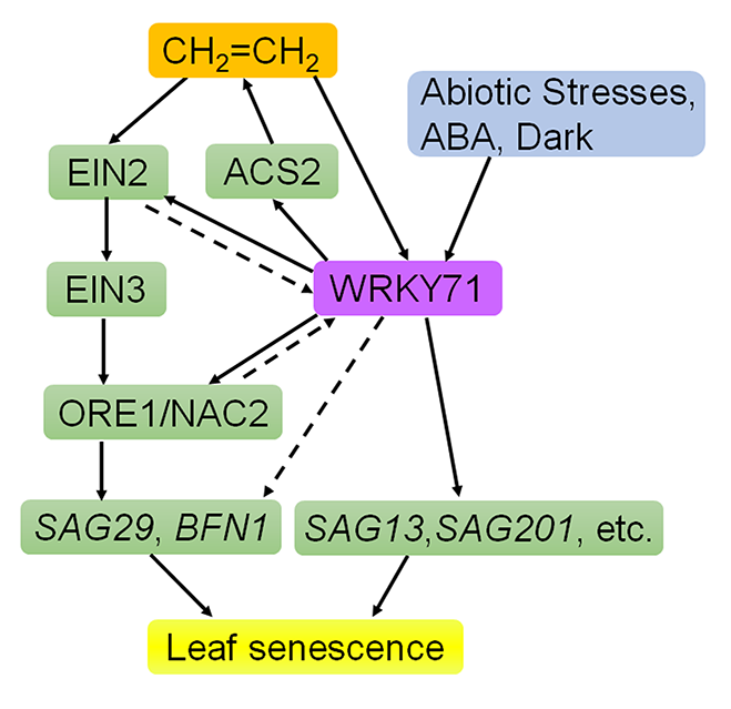 植物叶片衰老是植物生长发育过程中的自然现象。在叶片衰老过程中,植物会降解叶片内的脂类、蛋白质、核酸、碳水化合物等大分子物质以便能量回流再利用。叶片衰老看似简单,实则是一个高度严格有序的过程,受到各种外源和内源因素的调控。植物激素乙烯和WRKY转录因子家族成员在叶片衰老中发挥重要作用,但其相互调控关系和分子机制并不清楚。
