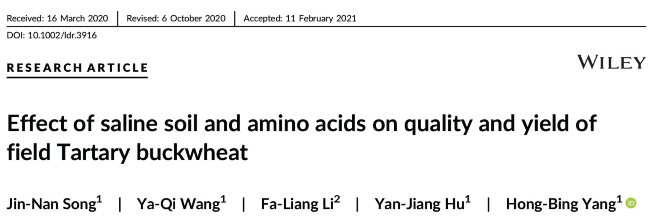 近期,必赢线路检测中心杨洪兵课题组在《Land Degradation & Development》(中科院1区Top期刊,5年平均IF=6.650)在线发表了题为“Effect of saline soil and amino acids on quality and yield of field Tartary buckwheat”的研究论文,探讨了喷施适宜浓度氨基酸对大田苦荞麦产量和品质的影响。必赢线路检测中心硕士研究生宋琎楠和王雅琦为论文并列第一作者,杨洪兵教授为通讯作者,青岛农业大学为第一单位。