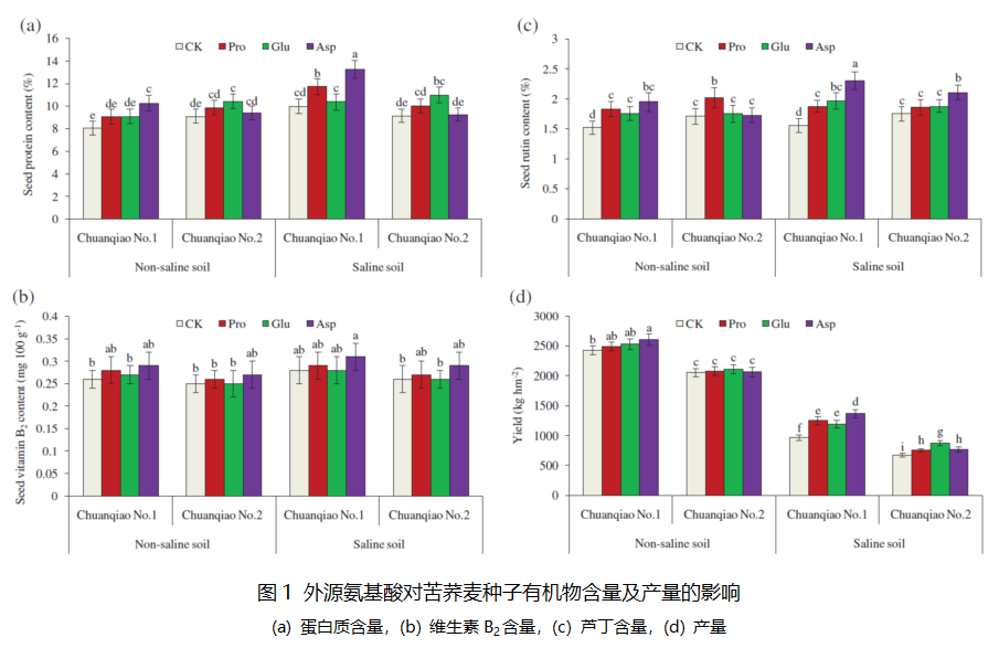 我国盐碱地面积约14.87亿亩,土壤盐渍化已成为限制我国农业生产的重要环境因素,而化学调控手段是提高作物耐盐性的有效措施之一,通过施用外源物质来改善作物的生理特性,将节省不少人力和物力。氨基酸是一种重要的细胞渗透调节物质,可作为外源物质来改善作物生理特性,课题组通过前期研究确定了外源Pro、Glu和Asp处理荞麦的适宜浓度,分别为30、60和40 µM,在大田苦荞麦苗期和开花期喷施适宜浓度氨基酸,苦荞麦种子钙、锌、蛋白和芦丁含量显著增加,品质明显提高;甜土地苦荞麦亩产量可提高8%左右,而盐碱地苦荞麦亩产量可提高30%以上,苦荞麦耐盐品种采用Asp处理效果最佳,苦荞麦盐敏感品种采用Glu处理效果最佳。通过喷施方式每亩苦荞麦氨基酸用量较少,费用较低,非常适合盐碱地推广应用。