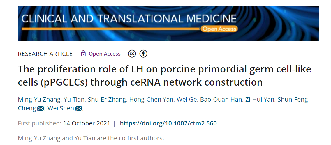 近日,必赢线路检测中心沈伟教授课题组在中科院一区、TOP期刊《Clinical and Translational Medicine》(IF=11.492)上发表研究论文“The proliferation role of LH on porcine primordial germ cell-like cells through ceRNA network construction”,首次揭示了促黄体生成素促进猪皮肤来源干细胞体外分化的原始生殖细胞样细胞增殖的分子调节机制。我校硕士研究生张明玉和田宇为该论文并列第一作者,沈伟教授与程顺峰教授为该论文共同通讯作者,青岛农业大学为第一和通讯作者单位。
