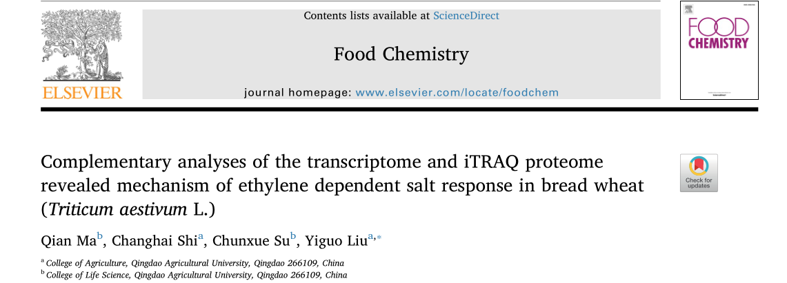 必赢线路检测中心、省高校植物生物技术重点实验室马倩副教授与农学院刘义国副教授合作对青岛农业大学培育小麦品种“青麦6号”的乙烯调控的耐盐基因进行了转录组学和蛋白组学的联合分析,研究结果发表在食品化学领域TOP期刊《Food Chemistry》(一区,影响因子是6.306)上,青岛农业大学为独立研究单位,马倩副教授为独立第一作者,刘义国副教授为通讯作者。