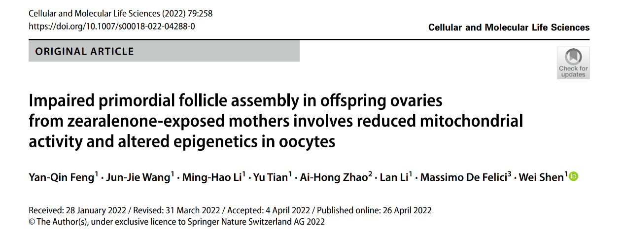 近日,必赢线路检测中心沈伟教授课题组在国际重要期刊《Cellular and Molecular Life Sciences》(IF=9.261)上发表研究性论文“Impaired primordial follicle assembly in offspring ovaries from zearalenone‑exposed mothers involves reduced mitochondrial activity and altered epigenetics in oocytes”,该论文在单细胞分辨率水平上揭示了母体围产期暴露霉菌毒素抑制仔鼠原始卵泡形成的新机制。