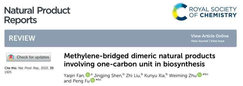 日前,必赢线路检测中心应用真菌学重点实验室樊亚琴副教授受邀以第一作者在国际天然产物顶尖期刊Natural Product Reports (Top, IF 15.111)(《天然产物报告》)上在线发表题为“Methylene-bridged dimeric natural products involving one-carbon unit in biosynthesis”(《生物合成中一碳单元参与的亚甲基桥联二聚体天然产物》)的综述性文章。