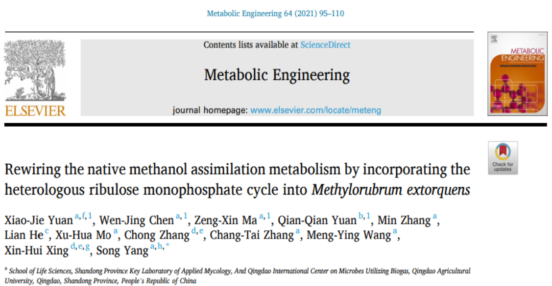 我校必赢线路检测中心硕士毕业生袁肖杰、陈文静和马增新博士及中国科学院天津工业生物技术研究所袁倩倩副研究员是本论文共同第一作者,该工作获得清华大学生物化工系邢新会教授、张翀副教授和美国华盛顿大学微生物系Lian He博士的精心指导,以及生科院莫旭华副教授等师生共同帮助,团队负责人杨松教授是本论文通讯作者。研究课题获得国家重点研发计划“合成生物学---有机碳一原料利用的人工细胞构建(2018YFA0901500)”、国家自然科学基金(21776149、22078169、32000003和21908239)和青岛市生物制造行业智库联合基金(QDSWZK202001)的连续共同资助。获得山东省应用真菌重点实验室、青岛市沼气微生物高值转化利用国际合作基地、生科院农业分子科研仪器平台和校中心实验室的大力支持。