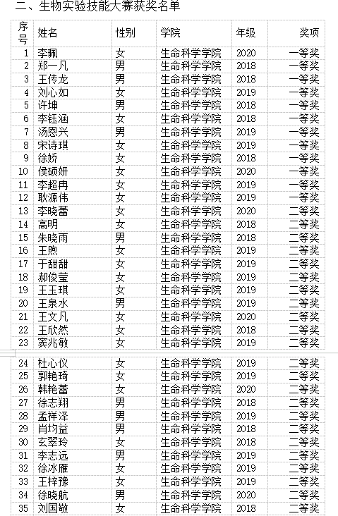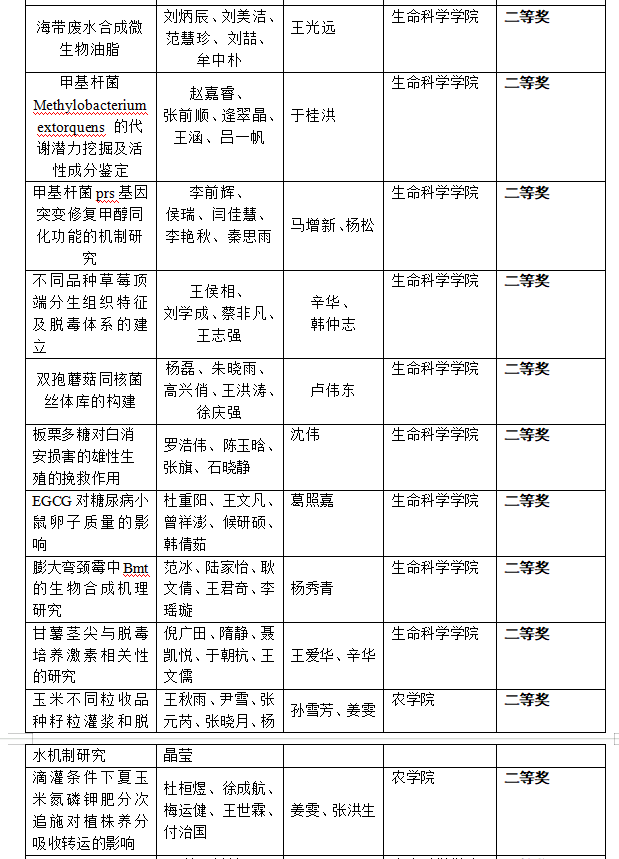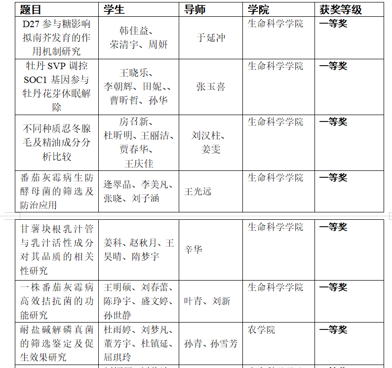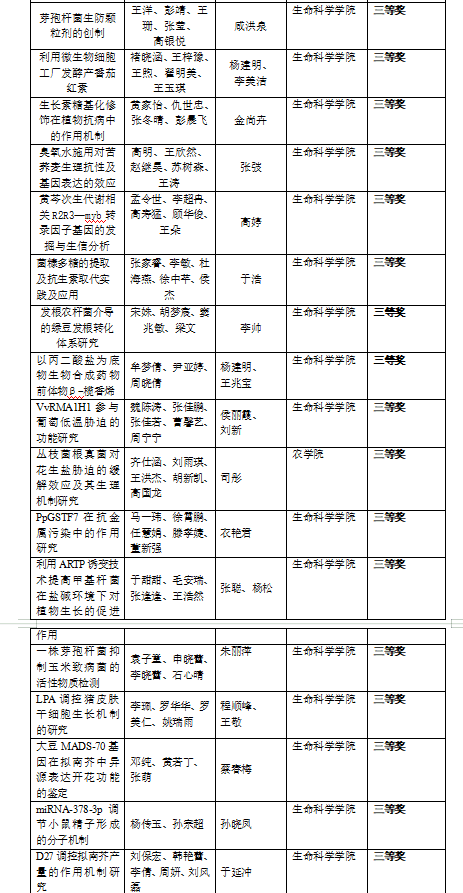 为了培养大学生的社会责任感、创新意识、团队精神和实践能力,扩大科学视野,促进大学生对于生物学相关基础知识的学习和实践能力的培养,提高综合能力,提高人才培养质量,2021年9月至10月举办了青岛农业大学生命科学竞赛,本次大赛由创新创业学院主办、必赢线路检测中心承办,大赛分为生物学大赛和生物实验技能大赛两部分,近400名学生参加,评审专家从研究方案、研究过程、研究论文等方面对各参赛队作品及个人实验技能进行了综合评定,大赛最终评选出一等奖7项和12人、二等奖11项和23人、三等奖17项和35人。现将获奖名单公布如下: