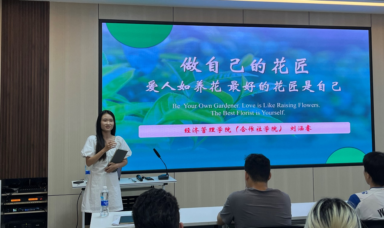 刘涵睿同学将个人的成长比作养花的过程,以“做自己的花匠”为主题,通过播种、发芽、伸根、繁枝、茂叶、驱虫、开花七个生动形象的过程,为同学们分享了自己在人生方向、坚定意志、时间管理、择友社交、情绪心态管理等方面的经验感悟,刘涵睿同学以其丰富闪光的经历,坚持不懈的毅力,清晰明了的逻辑,为同学们作了一场别开生面的分享交流会。